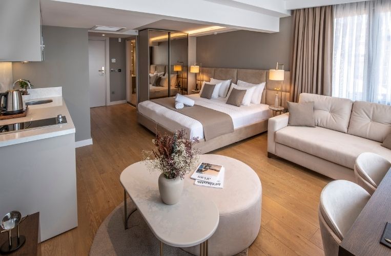 Our Elegance Suite with Balcony (35m2), have high-quality bedding in “King-size” format, a living room with sofa, kitchenette with ware, private bathroom equipped with a shower, a desk and an efficient wifi access. A haven of peace, in the heart of İstanbul, to enjoy a stay like at home.